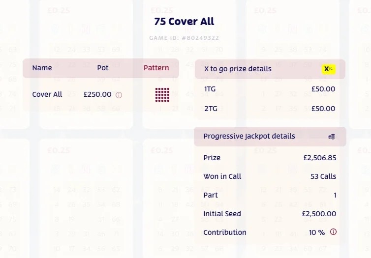 Now it’s time to find out more about the jackpot and get in the game. Once you’ve fired up the room’s lobby, you’ll see more information on the jackpot game in the top left corner. The progressive jackpot is £2,506.85 in the upcoming 75 ball bingo game below.