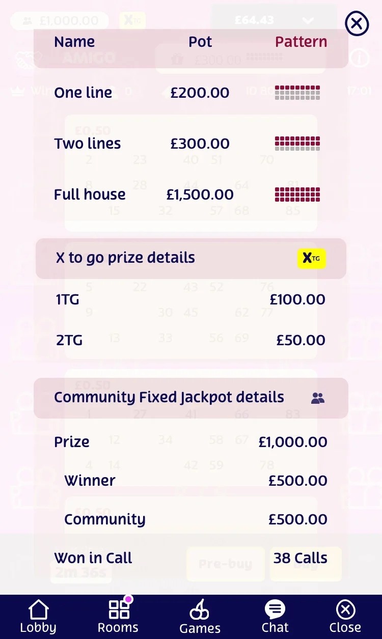 Don’t forget the ‘winning ball call’ condition, displayed as a number in a ball. You need to complete the jackpot requirement by the time that number of balls have been called. For example, in the game below, you need to complete the pattern within 38 balls to qualify for the £1,000 community jackpot prize.