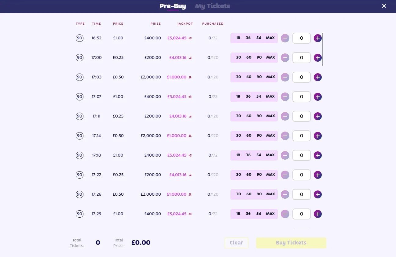 If you’ve got your sights set on taking down a jackpot but don’t have the time, you can always pre-buy tickets to upcoming games using the pre-buy page in our room lobbies.