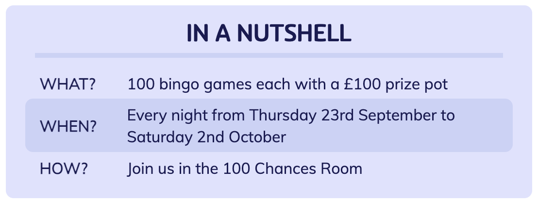 Autumn is well and truly here, and the weather forecast is in, so pop on your wellies and dig out your umbrellas because it’s about to start raining bingo! Over the next 10 days, you’ve got not one, not two, but 100 chances to win £100.