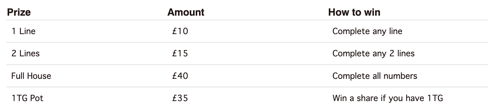 90-ball bingo game awards 1 Line £10, 2 Lines £15 and Full House £40. There is also a 1TG feature, all players with 1TG at the end of the game share a £35 prize pot.
