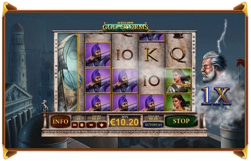Our first stop is Ancient Greece – make sure you wrap up warm because things are pretty windy over in Age of the Gods: God of Storms. This 5×3 slot might not blow you away but with 25 paylines, there are plenty of chances to win.