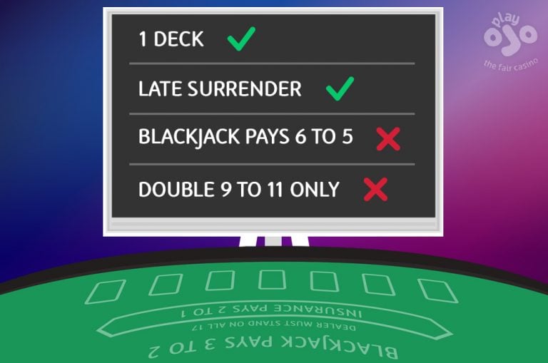 As a general rule, you should never accept payout odds for Blackjack of less than 3 to 2. Look for tables with rules which benefit the player (e.g. surrender, double on any 2 cards, split Aces more than once, dealer stands on Soft 17) and avoid tables where the blackjack rules seem to help the dealer (dealer hits on Soft 17) or where your options are limited (no resplitting of pairs).