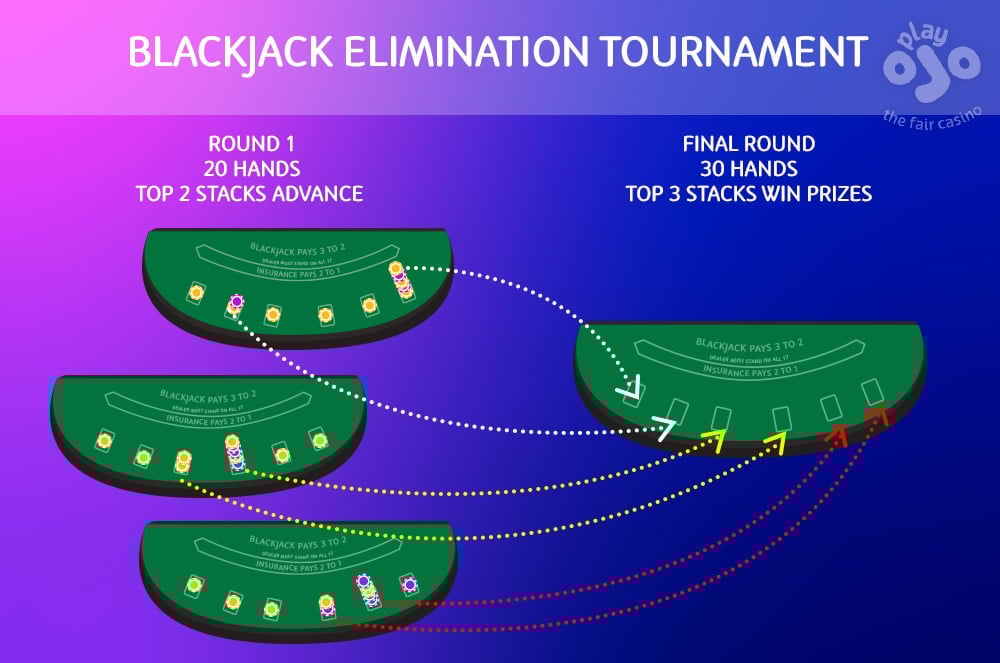 Blackjack tournaments are usually played in rounds, with players eliminated after each round. In each round, you will all play the same number of hands.