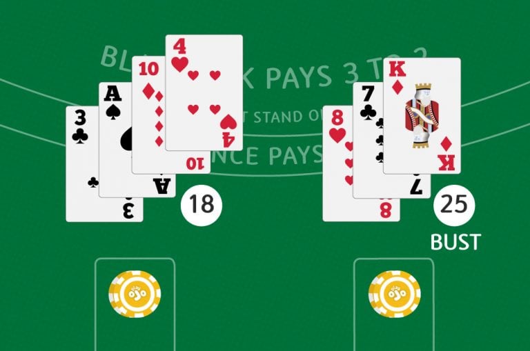By trying to make 21 or get close, you’ll often make more than 21 and when that happens, the dealer will announce “Bust” and remove your cards and your blackjack bet.