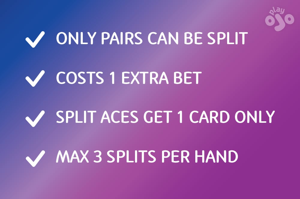 In blackjack terminology, splitting means turning one hand into two, and therefore you have to match your original stake so that both hands have an equal bet behind them. This is one reason I always make sure I have several bets in my stack, or that I lower my bet size so I am always happy to take opportunities to double or split when they come. Good bankroll management is part of playing smart and playing safely.