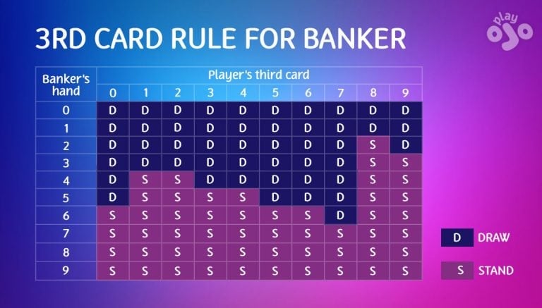 That’s an oversimplified version of how to play Baccarat when it comes to drawing 3rd cards. Here’s the actual table which decides if the Banker stands or draws. Don’t let it freak you out – the casino dealer (or online Baccarat software) will quickly follow these rules, you can just enjoy the ride.
