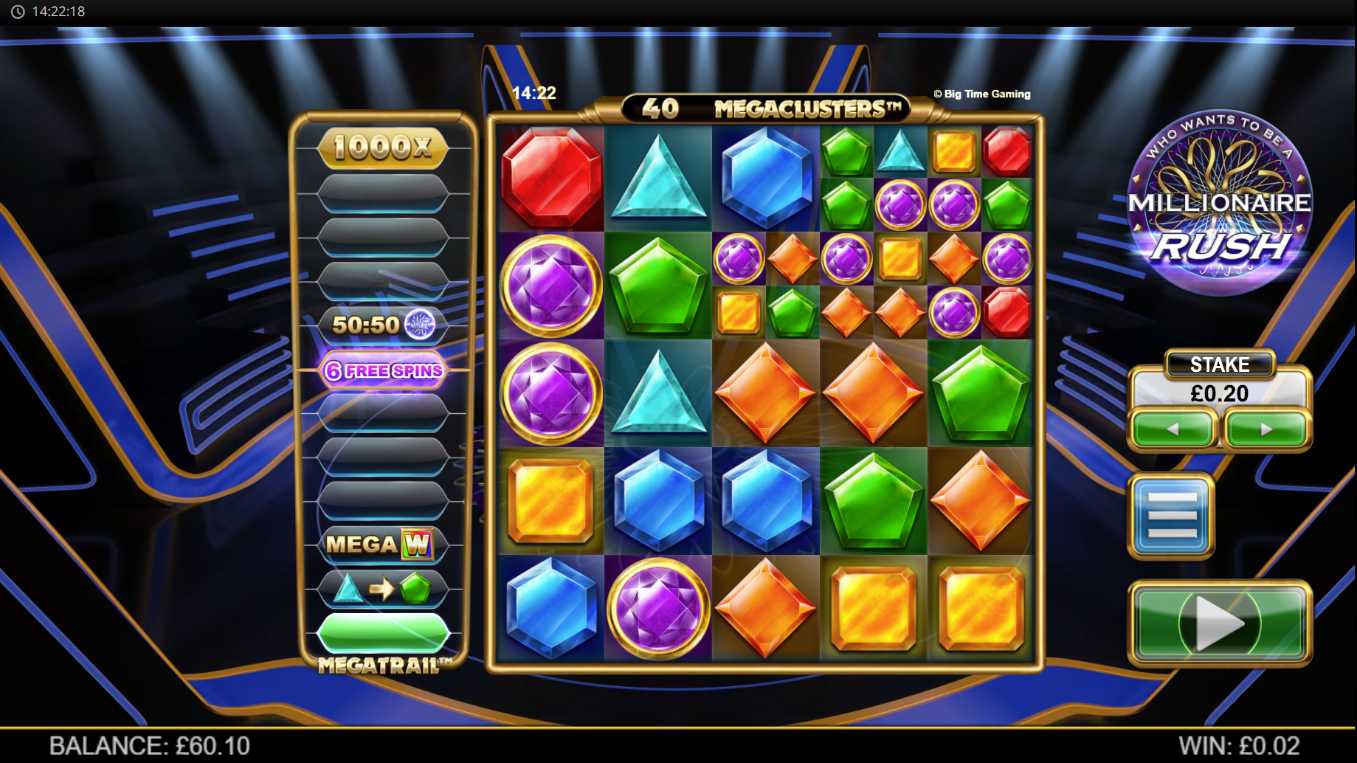Another top millionaire casino game by Big Time Gaming is Millionaire Rush. You start off with a 5x5 grid, but once megaclusters are activated, they expand and split into smaller boxes where new symbols appear.