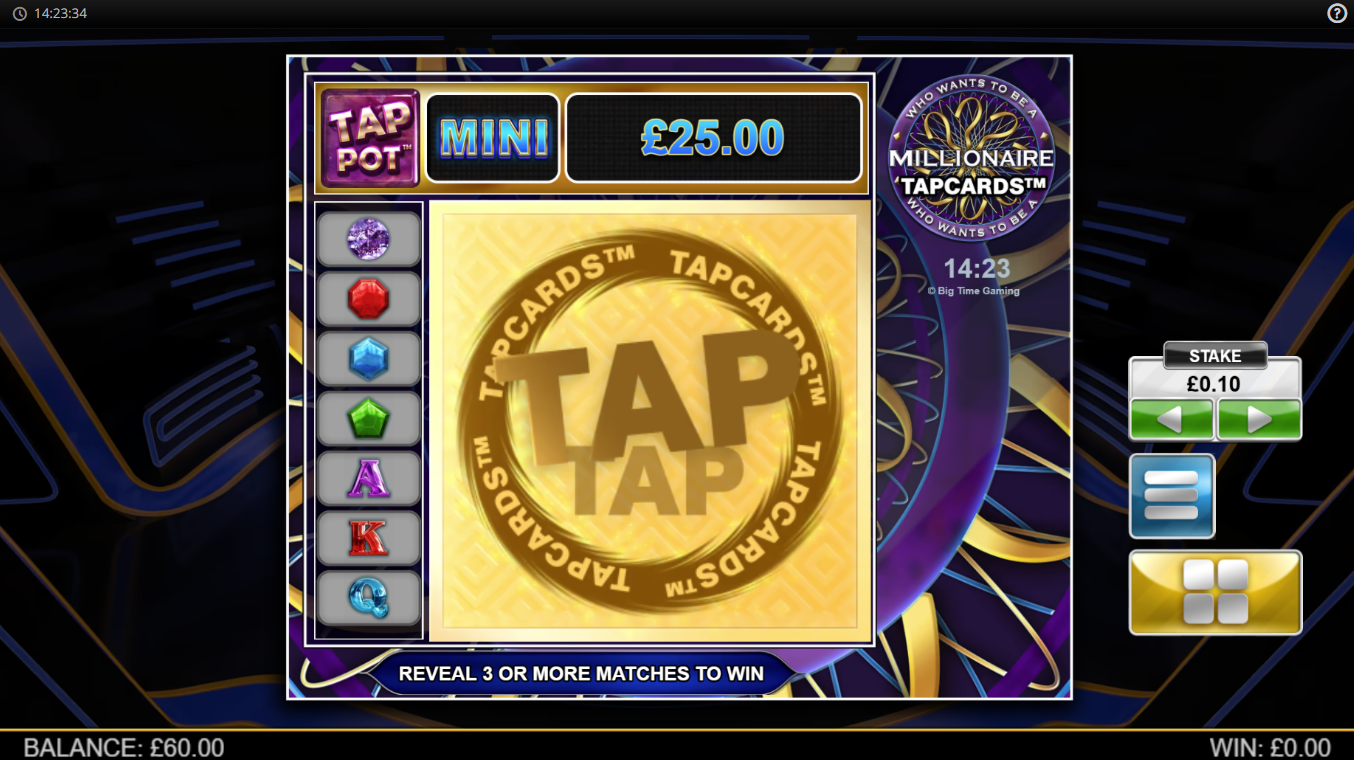 Millionaire Tap cards by Light and Wonder is a unique take on online slots. Instead of spinning reels, you get to ‘tap’ through cards that reveal symbols and potential prizes. Each card contains between seven and 16 symbols and you’re looking to match three to five symbols for a win.