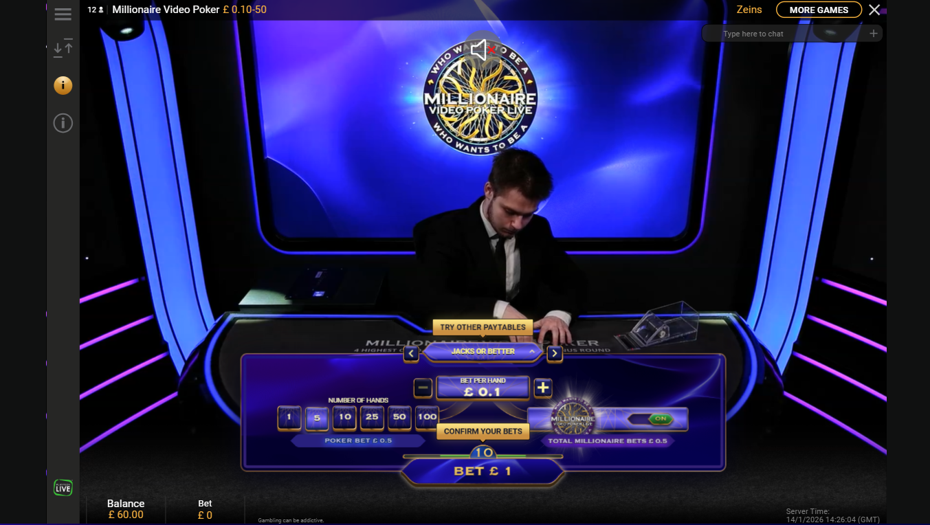 If you thought Who Wants to Be a Millionaire? couldn’t get any more exciting, think again. This innovative version by Playtech sprinkles live dealer video poker into the mix. There are five versions of video poker to choose from. Once you’ve made a choice, bets are placed and you have the option to bet on the Millionaire Bonus Round. The dealer deals five cards, after which you choose the ones to keep.