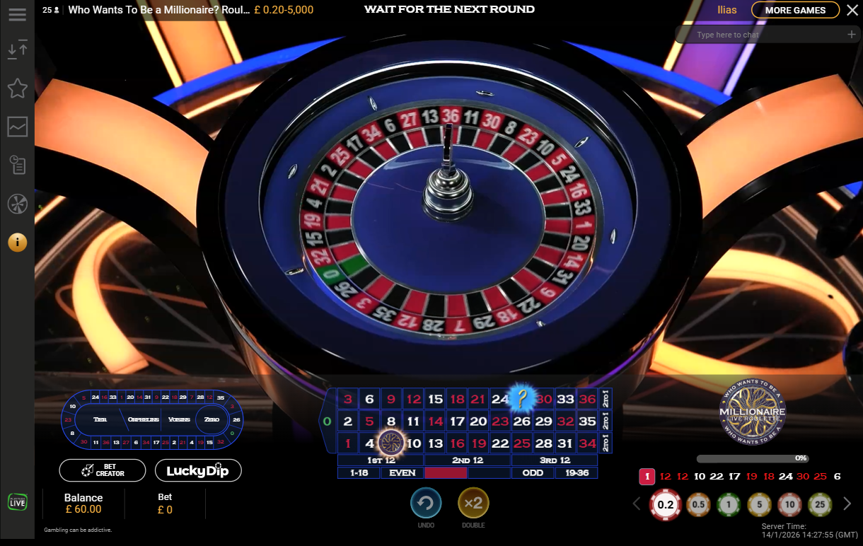 The fun levels have been cranked up a notch in Who Wants to Be a Millionaire? Roulette by Playtech. This game is played on a standard European roulette wheel with an enhanced bonus feature: The Millionaire Round. Up to 10 numbers are chosen as Millionaire numbers each spin. These are highlighted on the table with a quesiton mark, a multiplier or a Who Wants to Be a Millionaire? logo.