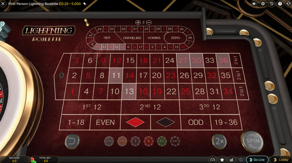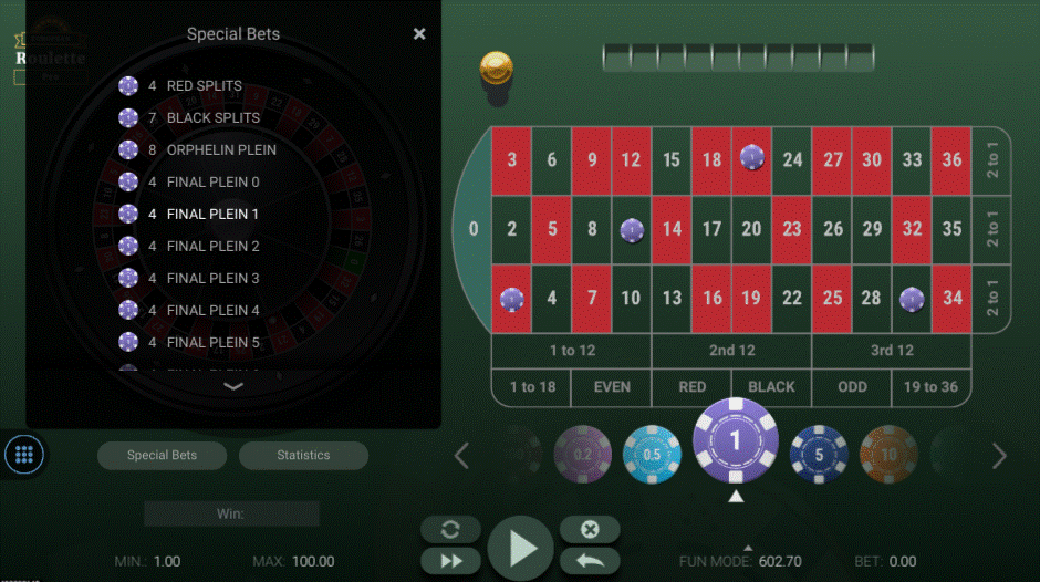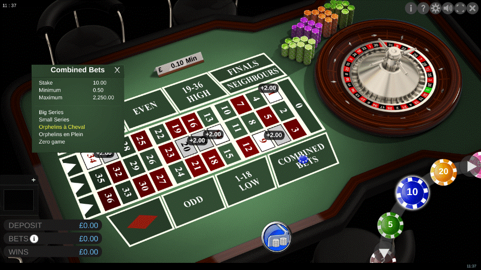 Known as ‘orphans’, the orphelins bet covers the remaining eight numbers that aren’t included in the above Roulette announced bets. These numbers fall between the tiers du cylindre and voisins du zéro bets, four numbers on one side and five on the other. Select orphelins on the racetrack (or from the Combined Bets option in the example above) to place this bet. Only one chip is needed for each of the five involved bets: