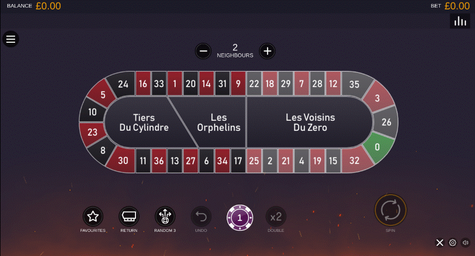 The neighbours bet in roulette involves a straight up bet on your number of choice, plus straight up bets on the two numbers immediately to the left and right of your chosen number on the Roulette wheel. To place this bet, simply click on your number of choice on the racetrack and the other four numbers will be selected automatically. That’s five chips for five straight up bets, all placed in one swift action!