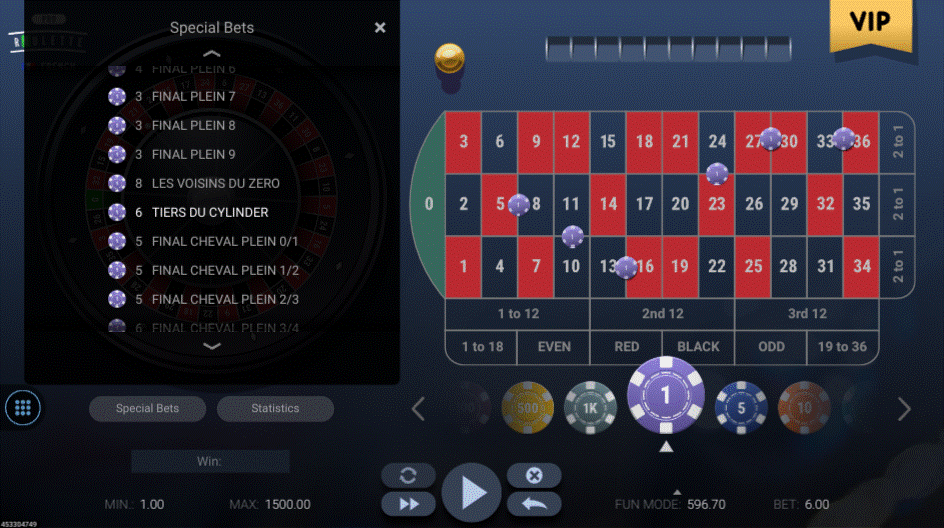 Translating as ‘thirds of the wheel’, the tiers du cylindre bet is similar to the voisins du zéro bet, but on the opposite side of the wheel. Click the tiers du cylindre section on the racetrack or in the Special Bets list to place this bet. It covers 12 numbers (about a third of the wheel, hence the name), with one chip placed on each of the six split bets: