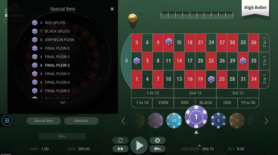 In other games, the Roulette call bets are listed menu style, such as in the above image of European Roulette Pro, where the bets are listed under Special Bets.