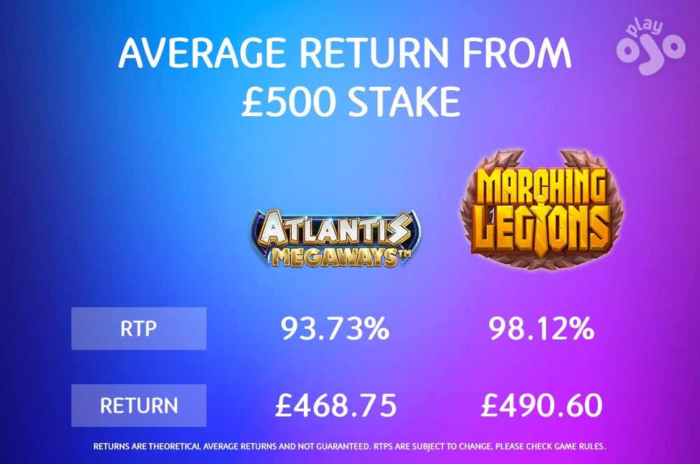 In around 1 hour of gameplay, you would spend £31.25 on Atlantis and £9.40 on Marching Legions. That’s why this matters to some players, though I should say that returns are calculated over thousands – even millions – of spins.