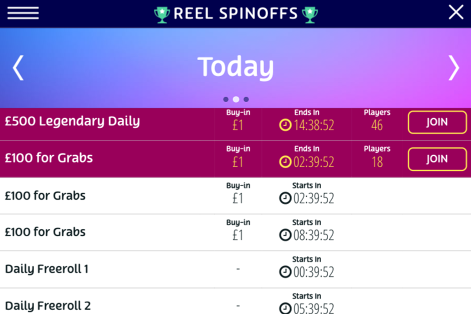 It’s super easy to find our slots tournaments. Simply log in to your account, click Kickers in the left menu, then click Reel Spinoffs at the top left of the popup that appears. You’ll then see a list of slots tournaments you can join.