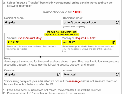 Copy the information provided in the Interac form exactly as it appears in the form.