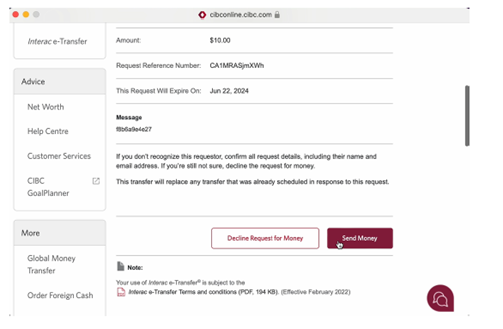 Select “Send Money” or “Send e-Transfer” to complete the transaction.