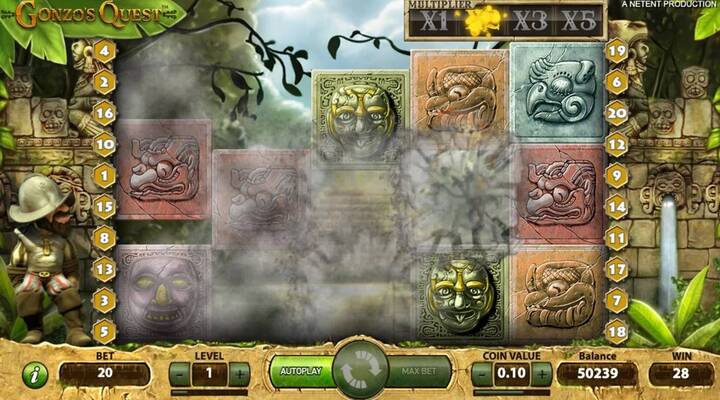 While Gonzo’s Quest slot may look like a regular online slot machine at first glance, with its five reels and three rows, once you begin playing you will know it is very different. This is because of the avalanche reels. Instead of regular reels that spin and lock into place, where you win based on the lines you bet on, this approach has stacks of blocks that fall down when you hit the spin button. If you hit one of the paylines, the blocks explode, and new blocks fall down into their place. Every time this happens you will receive a multiplier, with the first avalanche 1x, the second avalanche paying 2x, all the way up to 5x your original stake. So there is an opportunity to hit a big combo every time you hit the spin button!
