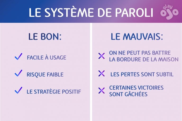 J’ai mis en évidence un certain nombre d’avantages du système de pari Paroli, ce qui est inhabituel, car j’ai normalement du mal à trouver des caractéristiques rédemptrices dans la plupart des systèmes de pari. Mais avec son approche prudente du risque, il y a beaucoup de stratégies pires que ce simple système de progression positive que vous pourriez essayer.