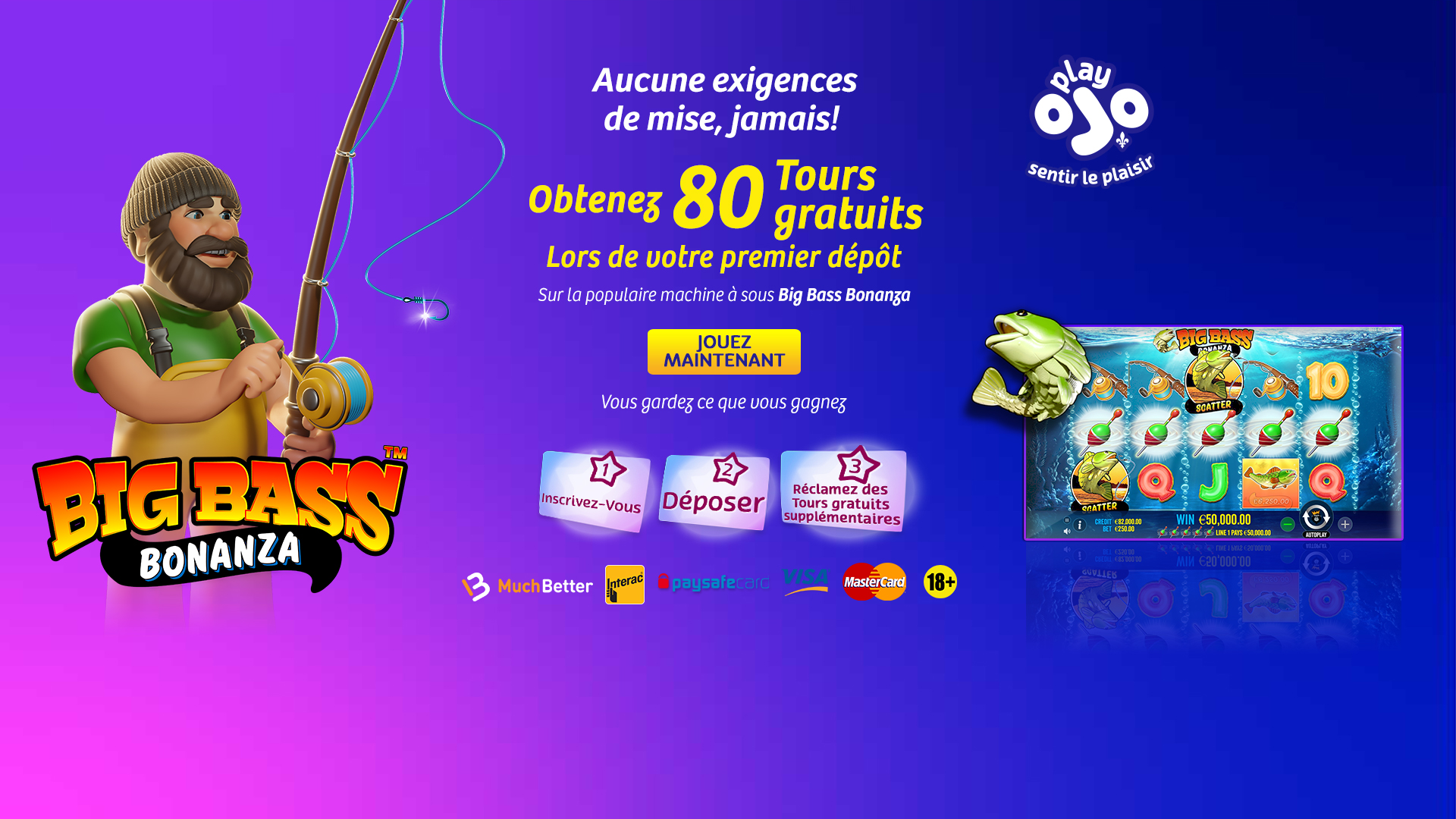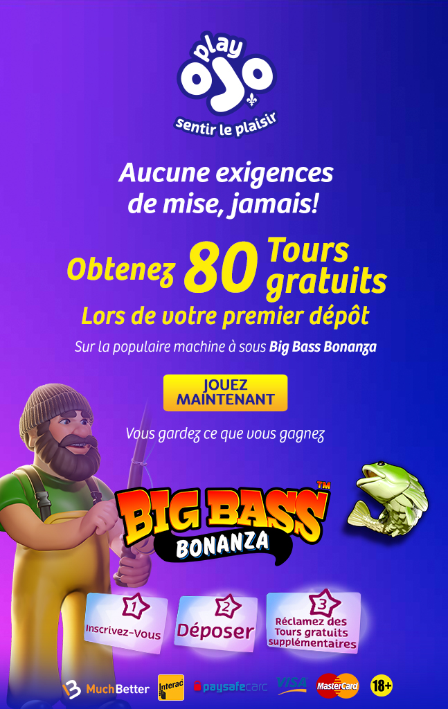 Premier dépôt uniquement. Dépôt minimum : $10. Jeu : Big Bass Bonaanza, Valeur des tours : $0.10 Cette offre ne peut être jumelée à aucune autre offre. Cette offre n’est offerte qu’à des joueurs spécifiques sélectionnés par PlayOJO. Si vous êtes arrivé sur cette page sans passer par l’offre exclusive de PlayOJO, vous ne serez pas admissible à l’offre. Le jeu irrégulier peut entraîner le retrait du récompenses. La politique de récompenses et de jeu d’OJO s’applique