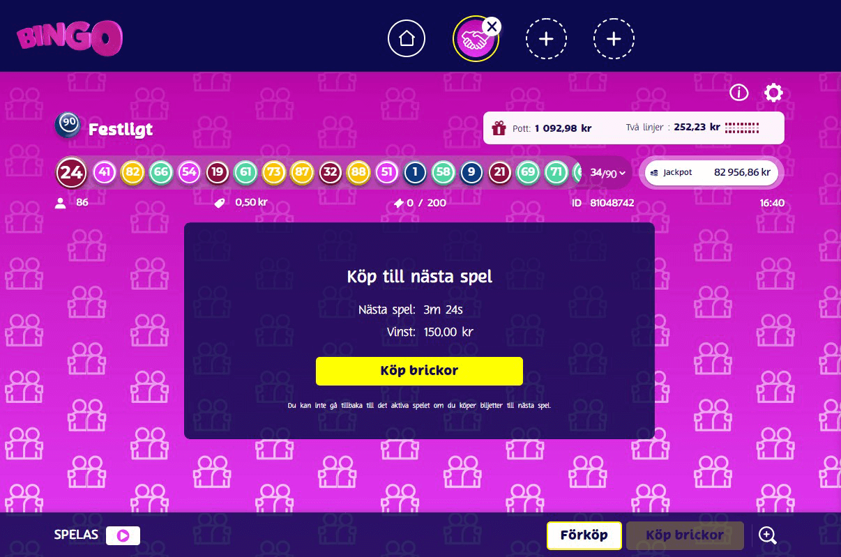 När du väl har köpt dina biljetter så väntar du medan numren ropas ut. Den här bingotypen inkluderar nummer mellan 1 och 90, vilket innebär att ett spel tar cirka 10 minuter. Det är fritt fram att använda Festligt-chattrummet för att chatta med andra spelare, medan du kollar in vilka nummer som ropas ut.