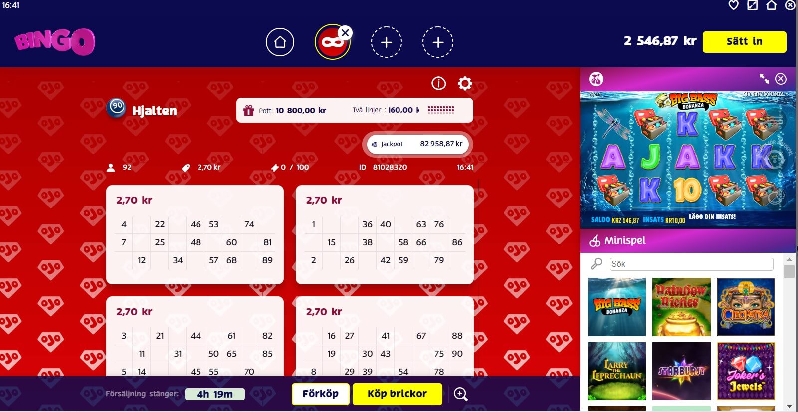 Efter att du köpt biljetter kan du välja att följa spelet live eller logga ut och kolla senare om du vunnit. Numren på dina bingobiljetter markeras automatiskt, men du kan även välja att göra det manuellt.