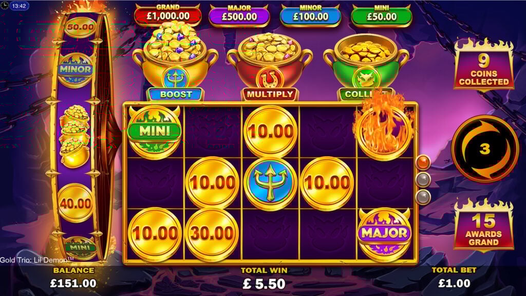 Den senaste Lil’ Demon-äventyret är fullproppat med eldig underhållning – men du behöver inte bara ta vårt ord för det. Spelet kretsar kring tre färgglada krukor fyllda med guldmynt som kan leda till riktigt spännande bonusar!