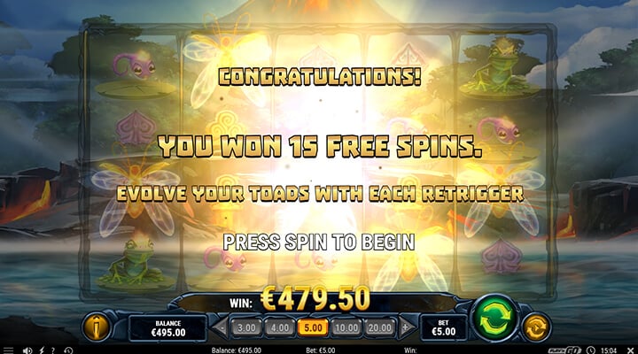 Efter detta är det dock möjligt att återtrigga läget, eftersom scattersymbolen fortfarande syns. Detta kan teoretiskt faktiskt göras oändligt antal gånger! Samtidigt kommer även grodorna att uppgraderas och växa!