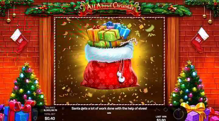 Lyckas du på så sätt fylla hela skärmen med julklappssäckar triggar du igång rundan med All About Christmas free spins! Du får inledningsvis 8 free spins där multiplikatorn efter wildstaplar alltid är x10.