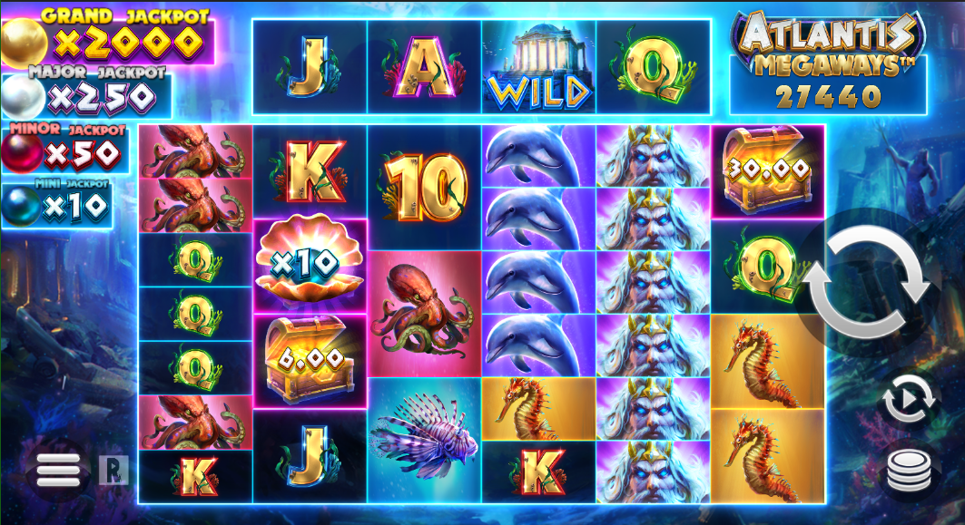 De fyra jackpottarna i Atlantis Megaways är inte progressiva. De har istället ett fast värde baserat på din insats. Aktuell insats är den som var aktiv när läget triggades igång.