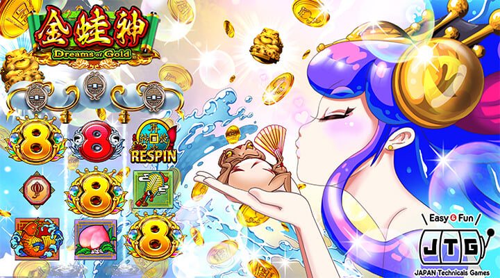 Mellan vackra klippor, intill ett stilla vattenfall, svävar en avslappnad groda på ett moln. Med solfjädern viftande drömmer den drömmar av en viss nyans. Vilken nyans då? Guld, förstås. Det här är ju Dreams of Gold slot, trots allt!