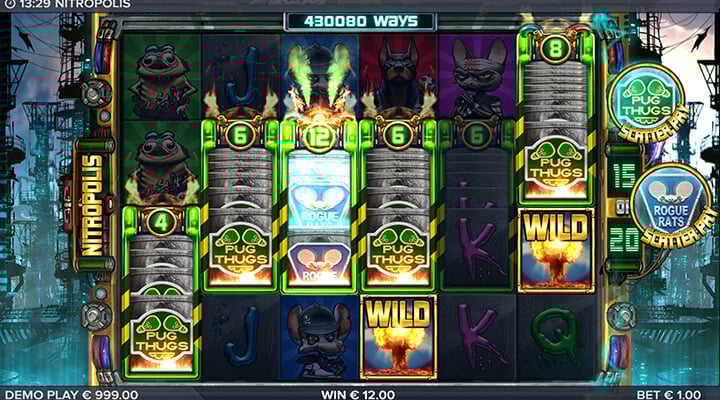 I alla fall är det den bilden ELK Studios i cyberpunkiga Nitropolis slot målar fram. Här följer du fyra gängs kamp mot herravärlde i staden Nitropolis – The Dirty Dawgs, The Gritty Kitties, The Pug Thugs och The Rogue Rats. Följ deras äventyr med wildsymboler, respins, free spins och innovativa Nitro Reels™.
