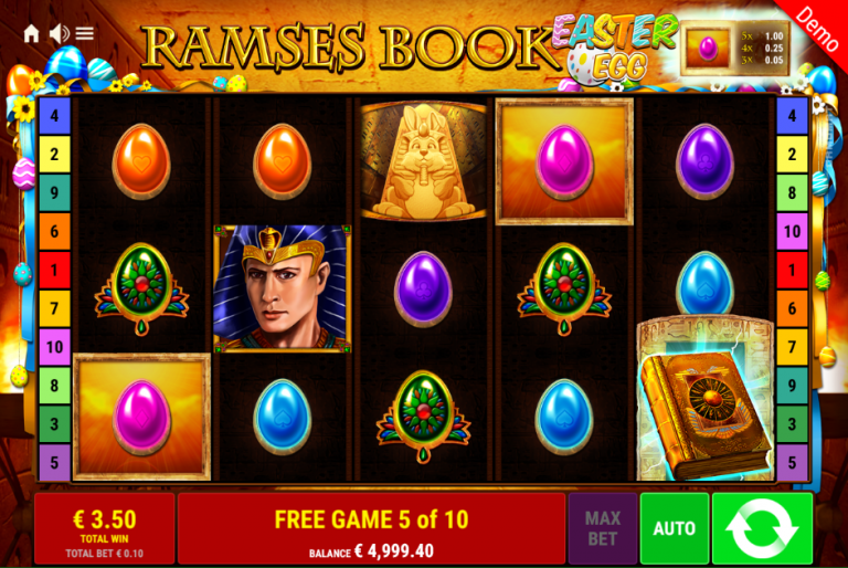 Ack, Egypten … Kan man få nog av att spela slots med egyptiskt tema? Vill du spela bland pyramider, faraoner, och skarabéer även under påsk ska du sikta mot Ramses Book Easter Egg av Gamomat. Känslan är klassiskt egyptisk, men den enda vanliga symbolen som inte är påskpyntad är den högst betalande med Ramses själv.