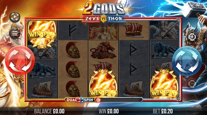 Det är här systemet med två snurrknappar kommer in i bilden – kallat Dual Spin Mechanic. Till vänster om hjulen syns Zeus intill en röd spinnknapp. Trycker du på den är vinsthållet vänster till höger. Trycker du på andra sidans blå knapp intill Thor är det höger till vänster som gäller.