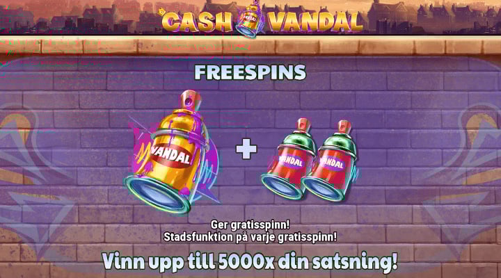 Får du däremot fram guldburken på hjul 4 och 2-3 röda sprayburkar på övriga hjul, får du Cash Vandal free spins! Hur många gratissnurr du får beror på antalet röda sprayburkar. 2 röda burkar, utöver guldburken, ger dig 5 free spins. 3 röda burkar, utöver guldburken ger dig 10 free spins!