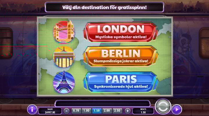 Snurrar du samtidigt fram guldsprayburken och 1 röd sprayburk (var som helst på de tre första hjulen) startar spelets ”Stadsfunktion”. Du får nu välja att resa vidare till antingen Paris, Berlin eller London. Samtidigt delas 1 gratissnurr ut åt dig med staplade wildsymboler på hjul 4!
