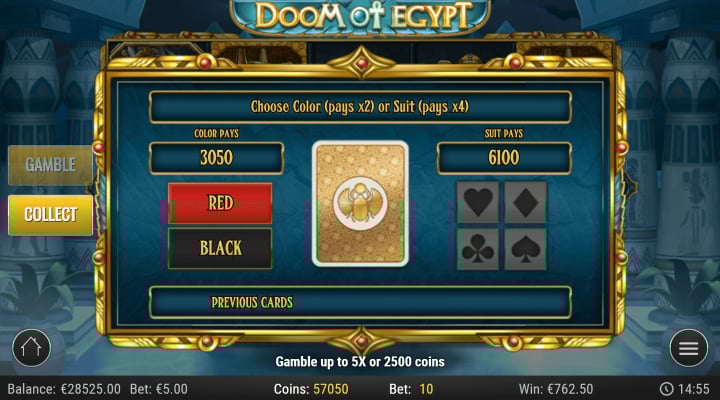 Om du lyckas få en vinst i Doom of Egypt slot har du ett val. Vill du håva in summan, eller vill du satsa den för att ha chans till en ännu högre vinsthögre summa? Väljer du det senare kan du klicka dig in med vinsten i ett litet minispel där du satsar på kort.