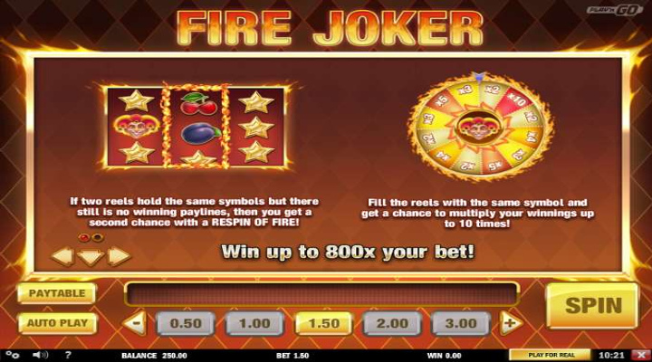 Fire Joker är ett tydligt exempel på hur det faktiskt är möjligt att ta ett traditionellt koncept och göra det till något nytt. Även om ingen lär överraskas av själva upplägget så kommer däremot jokerhjulet att förvåna många. När man lyckats få tillräckligt många jokrar, och aktiverat hjulet, så vet man aldrig vad som händer med ens vinst. Har du tur kan du lyckas öka den tio gånger om!