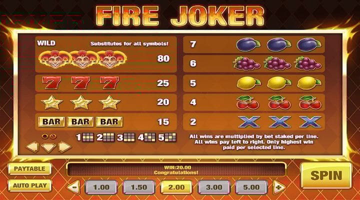 Med fem fasta vinstlinjer och en särskild jokerfunktion så är det lätt att avgöra huruvida man har en vinst inom räckhåll. Jokerfunktionen aktiveras när man lyckats få jokrar på samtliga hjul och rader. Det är även då som man har bäst chans att plocka hem storkovan eftersom jokern bjuder på multiplikatorer upp till tio gånger. Fire Joker jackpot finns definitivt inom räckhåll.