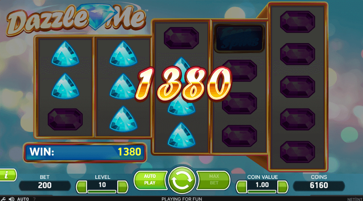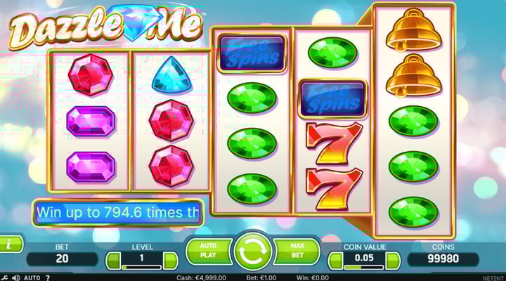 In true fruit slot fashion, the Dazzle Me slot has only six symbols, the 4 cut gemstones and the iconic bell and lucky 7 symbols. This is a low variance game, so it’s easy to hit small wins and there are lots of chances, with 2 bells and 7 sevens paying 1 coin a pop. The game’s max win is a modest 760X on any given spin, so this one’s definitely not for players who like the chance to hit big jackpots.