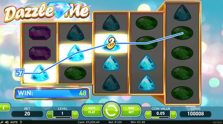 That’s Dazzle Me, a slot that combines the 3-reel 3-row slot games from the pre-internet era with some innovative stuff from the modern game to create a play experience that’s kinda unique!