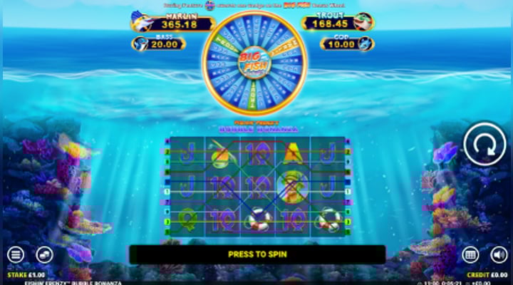 Fishin Frenzy Bubble Bonanza has a unique bubble mechanism that comes into play during the slot's two features: Free Spins and Bonus Wheel.