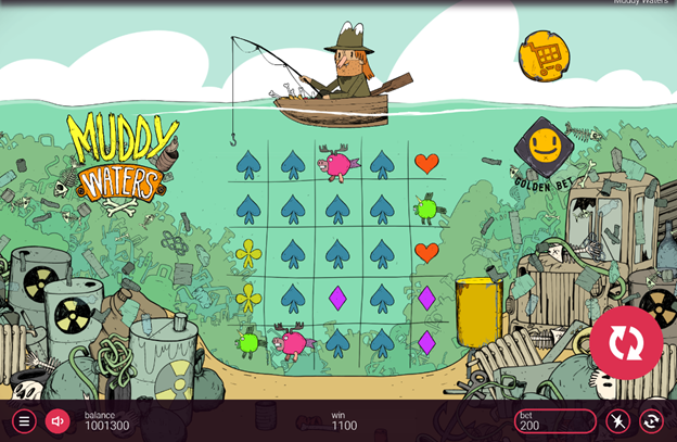 The star of the Muddy Waters slot is a scruffy fisherman floating in his tiny boat over dirty green waters. Below him, there’s a 5X5 panel that floats between radioactive debris. The only fish that have survived have become hideously mutated, but, while you wouldn’t want these guys for dinner, in the game, these fish are your friends and can land you some tasty wins. Lower paying symbols include spades, hearts, clubs and diamonds which pay out X2 your bet if you hit 5 in a row.